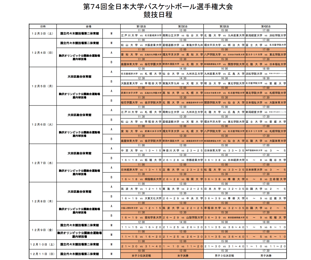 第74回全日本大学バスケットボール選手権大会 投稿者:kwiba2022年11月12日2022年12月24日カテゴリー:未分類 12月3日から開催されます第74回全日本大学バスケットボール選手権大会の組み合わせが発表されました。 関西地区からは「大阪人間科学大学」「立命館大学」「武庫川女子大学」「大阪体育大学」「関西学院大学」「関西外国語大学」が出場します。 組み合わせ・タイムスケジュールは以下からご確認ください。 公式HPはこちらからご覧ください! https://jubf.jp/news/detail/id/283 共有: クリックして X で共有 (新しいウィンドウで開きます) X Facebook で共有するにはクリックしてください (新しいウィンドウで開きます) Facebook クリックして印刷 (新しいウィンドウで開きます) 印刷 クリックして Threads で共有 (新しいウィンドウで開きます) Threads いいね 読み込み中…