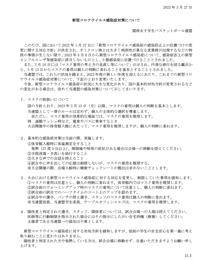 「新型コロナウイルス感染症の感染防止上の位置づけの変更に関する対応方針」が決定され、また、「マスク着用の考え方の見直し等について」が示されたことにより、当連盟として新たな基本指針を決定いたしました。