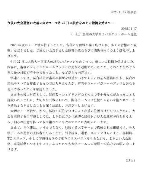 大会運営の改善に向けて 投稿者:kwiba2025年12月2日カテゴリー:未分類 11月17日(月)に、令和7年度第4回理事会を開催いたしました。 リーグ戦の終了を受け、当連盟では、大会を主催する団体として、公正かつ適切な競技運営・大会運営を徹底することを改めて確認いたしました。 今後も、より良い大会運営と事業活動の充実に努めてまいります。 協賛企業の皆さまをはじめ、関係者の皆さまには、引き続き温かいご支援・ご協力を賜りますよう、心よりお願い申し上げます。 共有: クリックして X で共有 (新しいウィンドウで開きます) X Facebook で共有するにはクリックしてください (新しいウィンドウで開きます) Facebook クリックして印刷 (新しいウィンドウで開きます) 印刷 クリックして Threads で共有 (新しいウィンドウで開きます) Threads いいね 読み込み中…
